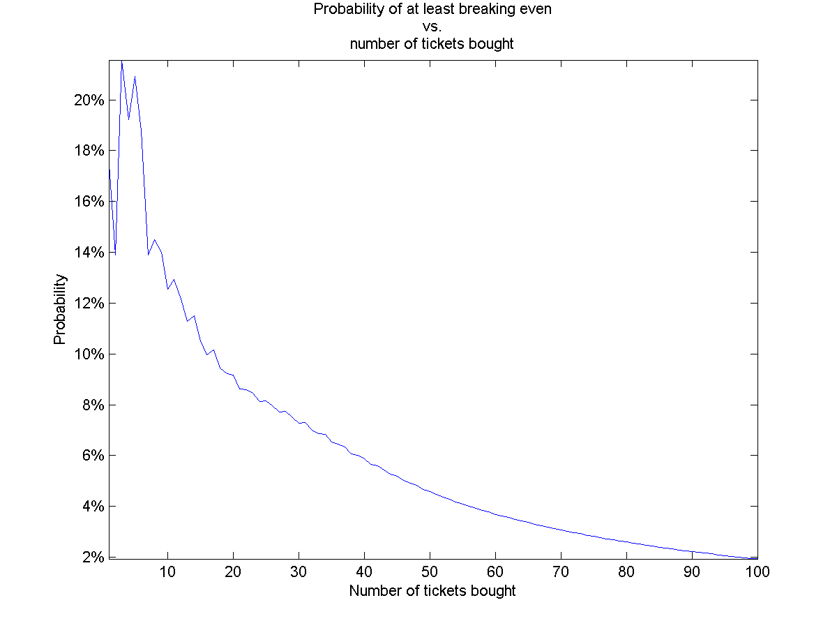 Note: While technically the the free ticket is a breakeven prize as they are both worth the same amount, they are not equal as you can not exchange the free ticket for a cash amount and walk away break-even. You are forced to continue playing the free ticket (and possibly again and again...) until you either lose or win a prize. More likely than not you will lose. This drops your chances of at least breaking even from the stated amount on the website to the odds calculated above.